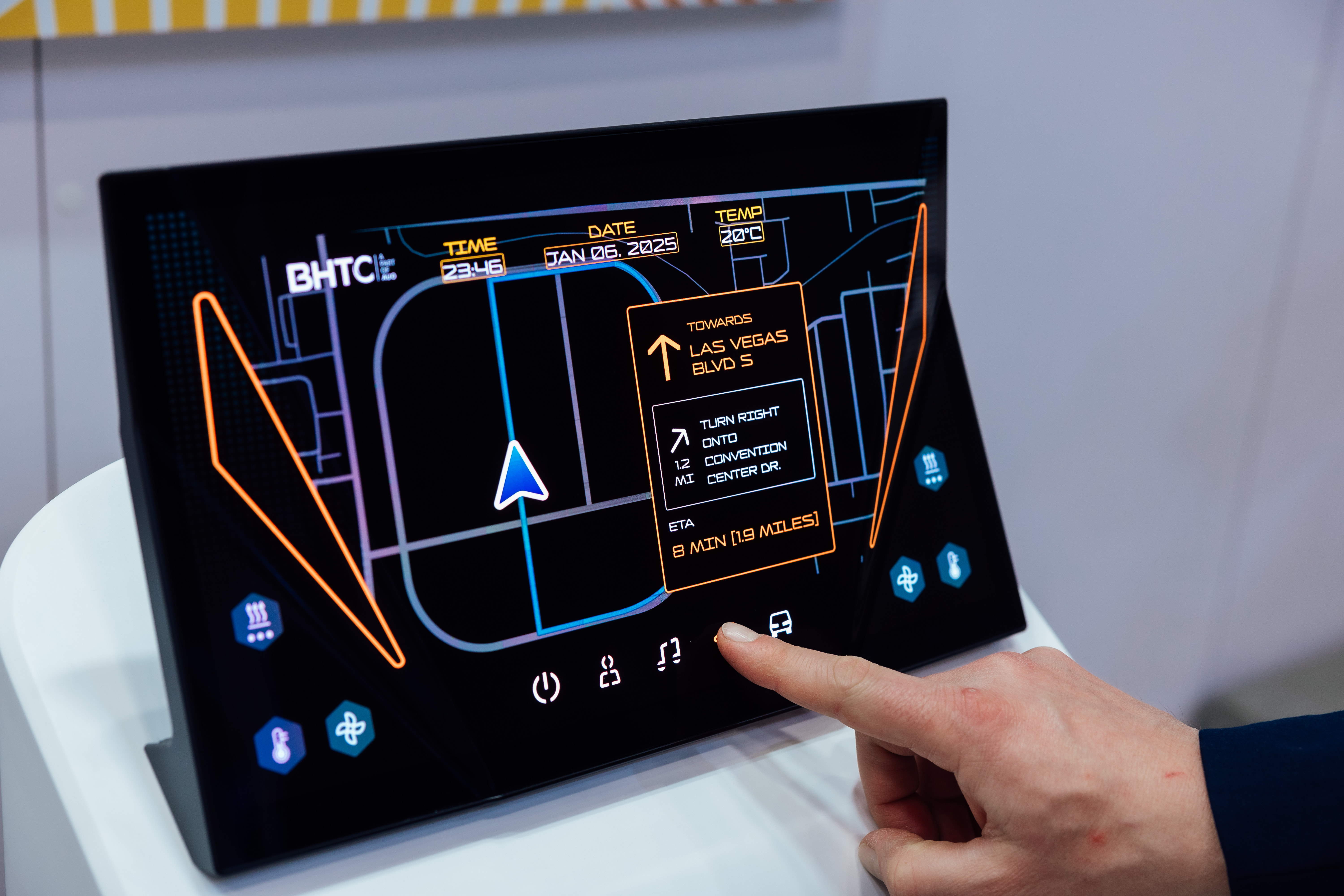 Micro LED可折迭觸控顯示器(Haptifold Display)結合BHTC多年HMI設計經驗,整合中控臺和溫度控制功能,以優美的曲面和獨特的外型助力車內設計美學,在輔以觸控回饋下,為駕駛帶來更直覺的使用體驗。